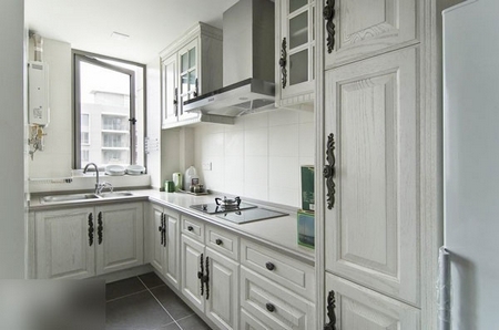 廚房內(nèi)部,白色木質(zhì)的整體櫥柜,很有質(zhì)感。白色的櫥柜上別具匠心歐式手把設(shè)計(jì),瞬間具有歐式古典風(fēng)格的雅致廚房呈現(xiàn)在眼前。