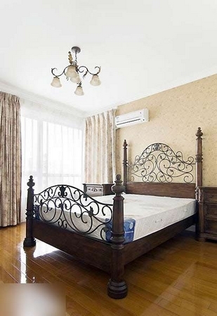 臥室的樣子,復(fù)古的木質(zhì)臥床,做工考究。