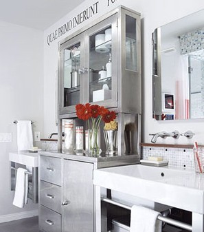 亮光的不銹鋼浴室柜搭配同樣高亮的白色潔具,相同的質(zhì)感為浴室?guī)砜釀攀愕膫€性元素;同時花卉的點(diǎn)綴能中和空間里的冰涼感。