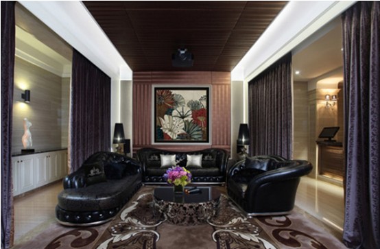 影音室:主人的另外重要活動空間是影音室,其中一襲客餐廳時尚特色,但顯得更時尚,最明顯的特征是使用紫色絨布作為隔斷,內(nèi)置酷黑皮質(zhì)沙發(fā),軟包吊頂?shù)取?/p>