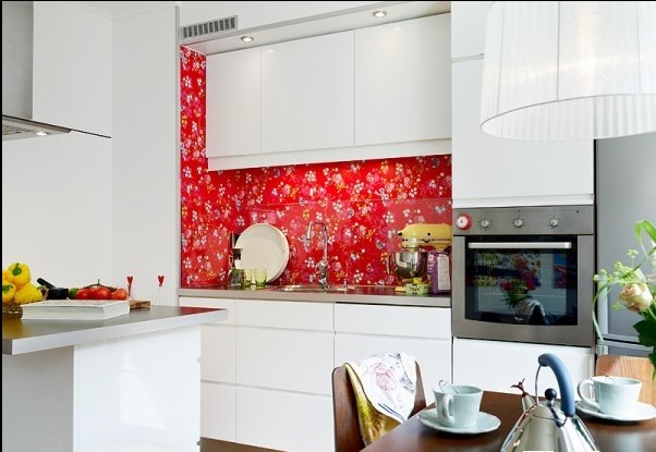沙發(fā)背景墻的裝飾畫是比較典型的北歐現(xiàn)代藝術(shù),與廚房背景面的那抹艷麗紅色相互對(duì)應(yīng)著。