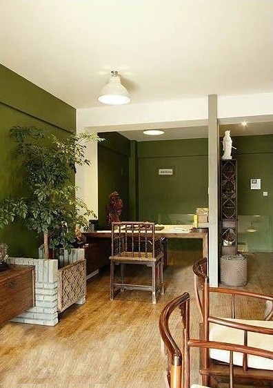 橄欖綠的墻面和樸質(zhì)的木地板相連,使得空間更具有生命力,  同樣也具有感染力。