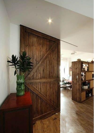作舊處理的田園風格實木門。與客廳背景墻的書架風格一致,醞釀著一種古樸帶有掩飾性的氛圍。