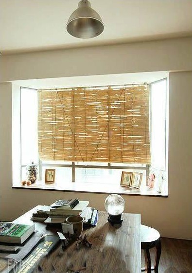 書桌,竹制窗簾。