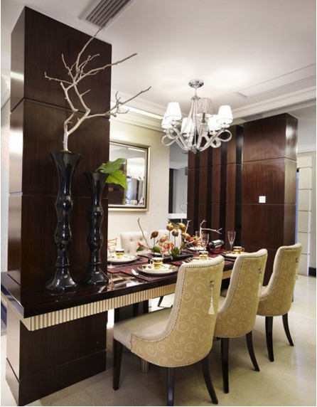 開闊的空間中,設(shè)計師采用了古典與老上海結(jié)合的手法,居室以奢華的淺金色調(diào)配以沉穩(wěn)大氣的木飾面、各類復(fù)古花型紋樣充斥于壁紙、軟裝擺件、裝飾布藝中,體現(xiàn)該居所奢華但不繁復(fù)、內(nèi)斂又不張揚。各式老上海小品,古樸的鳥籠、略顯沙啞的留聲機、百樂門式的吧臺,茶余飯后、身處其中,音樂悠揚的響起,仿佛又馳騁于十里洋場的老上海之中,與屋主高雅的品味、對于生活享受的態(tài)度完全相符。