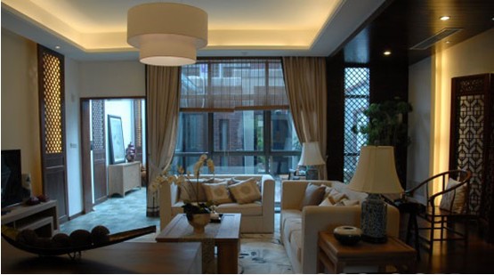 中式格子裝飾屏風(fēng),中式家具、中式燈具、中式風(fēng)格的裝飾品白色的沙發(fā)白色的窗曼,整個居室彌漫著典雅氣息。