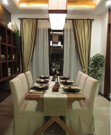 新中式元素的裝飾風(fēng)格體現(xiàn)的是素雅的氣質(zhì),因為從中可以顯示主人的喜好與品位;餐桌餐椅很普通,但是餐具的擺放,中央素雅餐布幾件餐桌飾品彰現(xiàn)餐桌文化;咖啡色澤色柜子擺放著藍(lán)白瓷器,淡米黃色的窗曼柔和雅致;不張揚,不簡單卻透**深博大的氣息,著或許就是新中式風(fēng)格(或者是新東方乃至新亞洲風(fēng)格)的精髓所在。