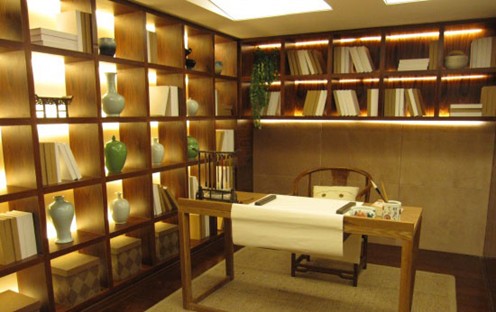 書房的氣場昭示了主人“文人墨客”氣質(zhì),閣架上工整的瓷器靜靜的等待主人的來到,也似乎在述說各自不同的來歷;橫豎擺放的書籍自然是主人另一大喜好,里面的經(jīng)典或許在等待主人的參與;書桌上的毛筆架、一張宣紙在左右鎮(zhèn)紙的伺候下,隨時等待著主人的繪就新篇章;書架后面的燈光又似乎在證明:書與文化是明燈,能照亮人生之路;