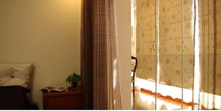原先有一組傳統(tǒng)家具,一個三人位+兩個單人位實木沙發(fā)椅及茶幾、邊幾。為了更溫馨,也讓人坐進去更舒服和具備休閑感。我們把三人位實木沙發(fā)換成了藤制紅色布藝沙發(fā)。沙發(fā)是網(wǎng)購的,尺寸、藤編紋樣和布料都是精心挑選。當沙發(fā)送到現(xiàn)場當晚我就迫不及待去看,很滿意。沙發(fā)背景墻原先創(chuàng)意是水墨畫的藝術(shù)壁布,后來因為造價超預算決定放棄,現(xiàn)在看到的是請一個畫家朋友參照我們選的小樣而現(xiàn)場繪制的丙烯壁畫,沒想到出來的潑墨效果讓人驚嘆!客廳到西陽臺之間有兩扇移門,為了在移門開啟后能夠隱藏起來,特別設計了一組裝飾柜,顏色和飾品體現(xiàn)休閑文化與中國傳統(tǒng)文化的融合。沙發(fā)邊幾上的青瓷臺燈幾乎融入背后壁畫里。茶文化在中國源遠流長,試想在水墨畫中品著茶香的感覺是多么棒!