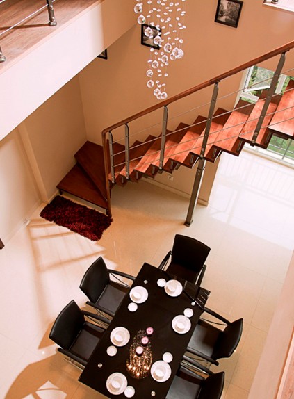 餐廳的燈用數量來打造餐飲空間的細膩變化;黑色的餐桌、白色的餐具、下垂的乳白色的工藝燈,簡單而具大手筆;