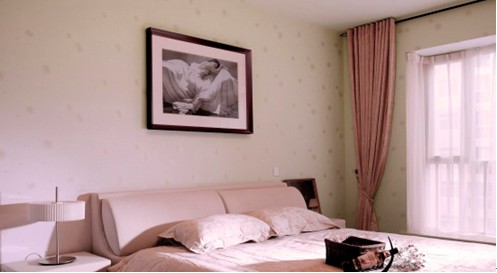 墻上大幅照片很好體現床寢文化意境,淡雅細碎的圖案墻紙、粉紅色的床上用品、粉紅色窗紗、桃紅色的窗簾,體現主人細膩性格;
