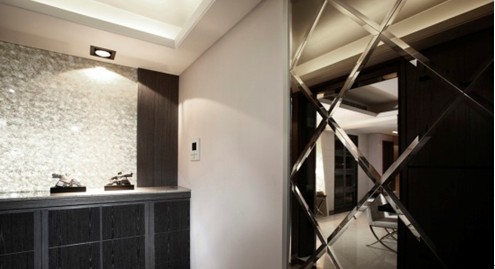 玄關(guān)的茶鏡開闊了空間,墻紙與木飾面的對比則市線條與塊面的結(jié)合;燈光再次成為光線的主角;
