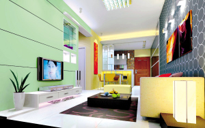 考慮房主是年輕活潑的女孩,明庭中采用活潑明亮的主色調(diào),把電視背景墻刷成果綠色。其余的功能也在這面墻上做文章:上邊設(shè)計(jì)了裝飾柜,緊鄰小電視柜旁邊再并排放書桌。空間利用充分、有序。