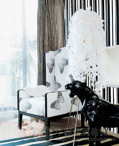 白色的蝴蝶圖案單人坐椅為臥室里的休閑空間帶來(lái)了纖柔的優(yōu)雅感,再配以夢(mèng)幻感的發(fā)絲造型燈和充滿野性的仿真雕塑,臥室的休閑區(qū)便具有了貴族的氣質(zhì)。