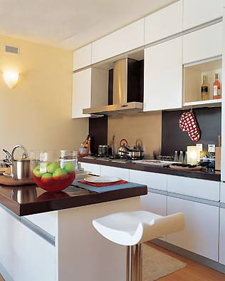 圖一中的廚房就是通過局部重色的點(diǎn)綴,然后配比大面積的淺色系地磚,讓居室空間看上去高挑但又不失重點(diǎn),葉國密說,開放式廚房的頂面采用磨光的黑色石材,表面光滑如鏡,能夠反射居室光線,與高亮度地磚形成強(qiáng)烈對比,這種方式不僅可以在開放式廚房中使用,對于小戶型的吊頂也不失為一種劍走偏鋒的方式