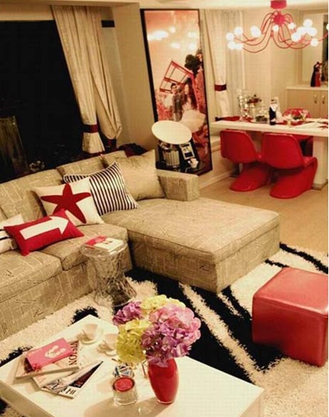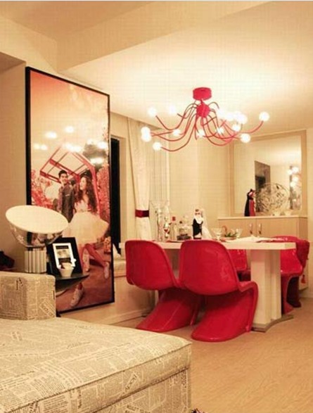 空間整體基調(diào)的黑、白、紅,在世上氣味濃厚的同時(shí)又可以帶上那一抹紅,喜慶,浪漫。整體空間在飾品的選擇上加一些黃、綠色。