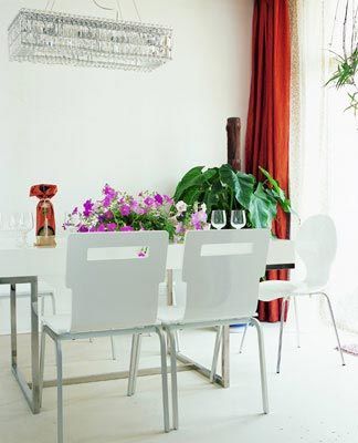客廳與餐廚空間是開(kāi)放貫通的,白色的鋼架桌椅,剔透的水晶吊燈和酒具,一捧盛放的鮮花,格外養(yǎng)眼。