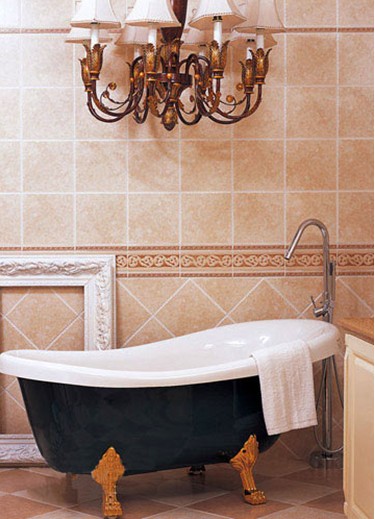 金黃色的浴缸支架,橢圓形的黑色浴缸,色彩相互協(xié)調(diào)搭配,精致典雅,制造出單純的沉穩(wěn)效果。加以歐式古典吊燈點綴,使整個浴室洋溢著歐式浪漫風情,彰顯出大氣華貴美感。