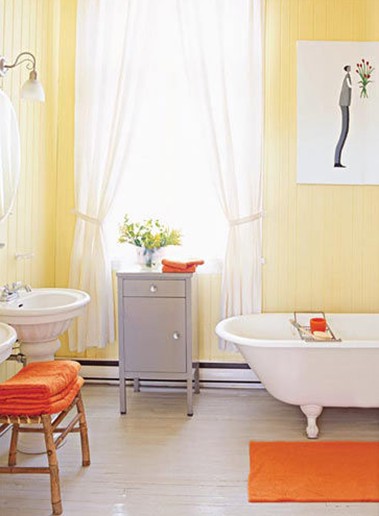 白色的背景墻面,大而透亮的窗戶,讓狹小的衛(wèi)浴空間變得舒適大方,白色產(chǎn)生的明亮雪白感,最具有反射效果,它將光線帶進(jìn)陰暗的室內(nèi),也可彌補空間的不足缺憾。而溫暖的黃色柔和,橙色明亮歡快,三色相撞搭出別具一格的浴室空間效果。