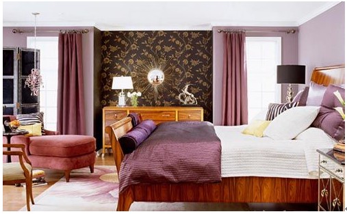 臥室也運(yùn)用了高貴的紫紅色,盡顯出室內(nèi)的華貴,配上富有質(zhì)感的家具,令臥室如豪華酒店套房般品位。金色的植物圖案的壁紙搭配深紫色墻面,混搭的效果凸顯出墻面的立體感,而大量的銀色金屬元素,與艷褐色睡床座椅、以及木質(zhì)紋理的地板都彰顯出低調(diào)的奢華感。地面鋪設(shè)的花瓣地毯融合了深淺多種的紫色調(diào),襯托出洋紅色扶手椅和高貴的紫色綢緞。頂部粉紫色水晶燈飾,營造愜意舒適的氛圍。