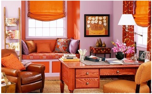 書房紫色與橘紅色的撞擊,與眾不同的色調(diào)搭配,創(chuàng)造出一個(gè)另類的書房空間。橘色的大量運(yùn)用,與紫色墻壁相得益彰,活潑的圖案印花與飽滿的酒紅色交錯(cuò),營造出溫暖明亮的居室氛圍。飄窗處橘紅色墻面強(qiáng)調(diào)了陽光和陰影,形成漂亮的反差效果。天鵝絨和繩絨線的靠枕,對(duì)房間色調(diào)的多樣化做出了很好的點(diǎn)綴,淡紫色投影增亮了房間,把飄窗刷成紅色令帷幔與紫色調(diào)平衡,將多種色彩貫穿融合。