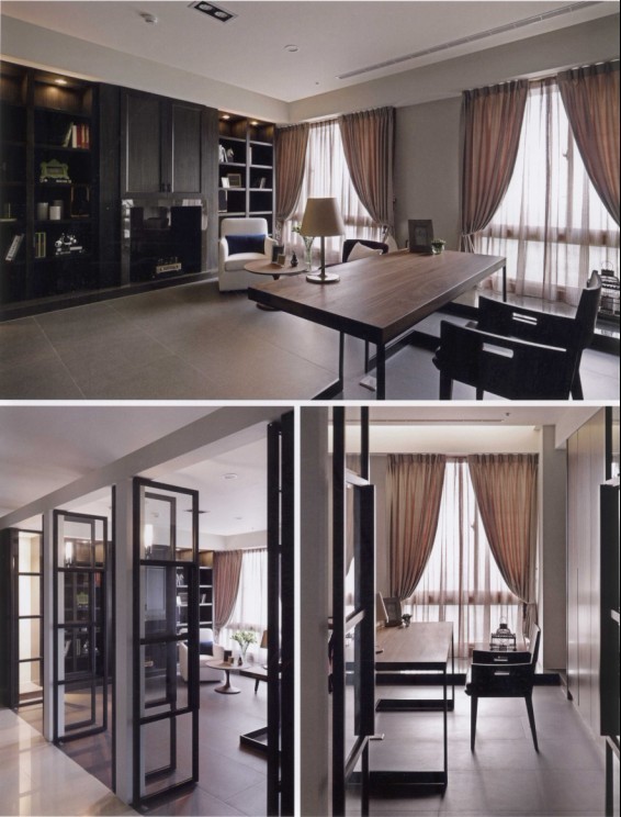 考量到未來(lái)使用性,將三房中的一房放大作為書(shū)房。深色基底以淺色軟件為主軸,構(gòu)筑出開(kāi)放式書(shū)架造型,輔以奢華卻線(xiàn)條極簡(jiǎn)的壁爐,創(chuàng)造出美式現(xiàn)代感的書(shū)房空間,也讓屋主音響收藏有了適當(dāng)?shù)陌才拧?/p>