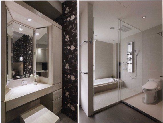 很少人家會(huì)在衛(wèi)生間的地面用地板,這家卻是,因?yàn)樗嬲龅搅烁蓾穹謪^(qū)。每一個(gè)可能占到水的部分都以巧妙挑高的手法分隔開(kāi)來(lái),既能美化空間,又實(shí)用之及。