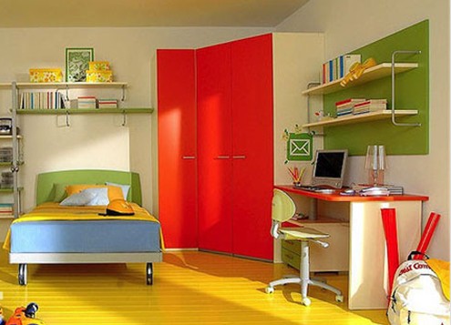 強光照射在明黃色的地面上顯得非常溫馨,這樣的兒童房設(shè)計就算沒有陽光的照射,也抵擋不了散發(fā)出的溫馨味道。房間顏色較多,且多用撞色搭配設(shè)計,很大膽的色調(diào)選取,紅與黃自然是最好的搭配。少許綠色的點綴,房間也愈加顯得明朗活躍。