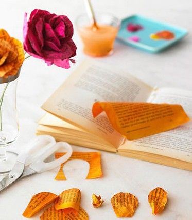 1:將書頁撕下進(jìn)行染色,畫出玫瑰花瓣的形狀后剪出若干成型。
