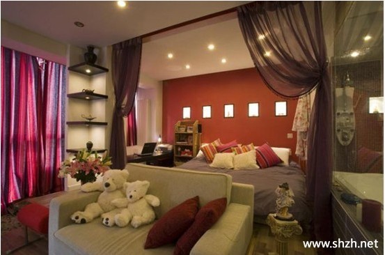 帷幔在空間的表現(xiàn)形式通常有兩種,一種是掛在床第周圍,將床從空間中分隔出來。閉合帷幔,將床圍合成一個封閉、私密的空間,拉開帷幔,又能夠成為床的一種裝飾,溫馨而又浪漫。另一種是將帷幔作用軟隔斷,起到限定空間的作用,將相對較大的空間分成兩個或更多個部分,能夠有效地利用空間,同時又不破壞空間的美感。