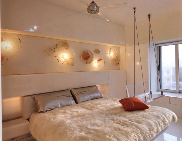 在這個空間的設(shè)計(jì)中,床作為軟裝飾的主角,為了突出其溫馨、高貴而又不失現(xiàn)代感,在色彩上采用白色為主色,裝飾材質(zhì)采用毛絨,在突出高中的同時更能增加溫馨的氣息。