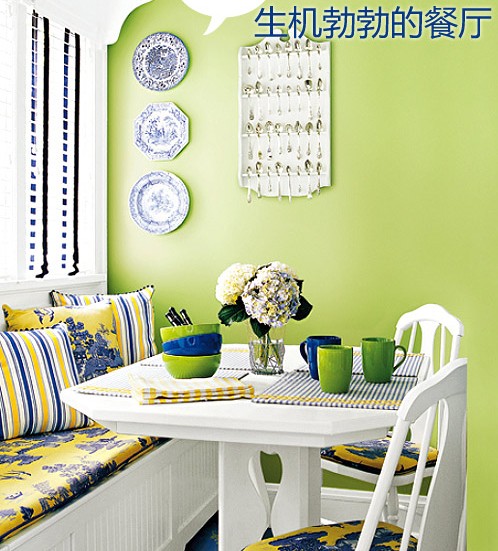 柳綠墻體映襯白色亮光漆面家具,即便在小面積的居室中,也能顯得舒適和現(xiàn)代。帶有花卉或條紋圖案的黃色靠墊,能起到點(diǎn)睛作用,青瓷圖案把這些色彩貫穿在一起。