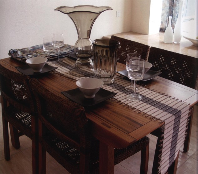 在木質(zhì)餐桌上,臺布的存在更強(qiáng)調(diào)其裝飾意味,用類似竹簡的樣式來設(shè)計臺布的造型,與純木的餐桌相搭配,能夠能人以更加真實的復(fù)古的感覺。