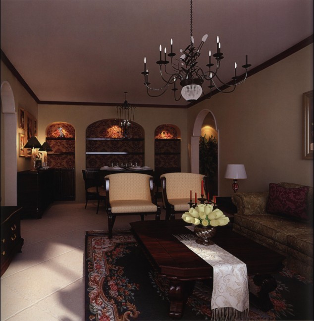 在這個具有經(jīng)典古典風(fēng)格的室內(nèi)設(shè)計中,通過桌布的設(shè)計,為濃重、低沉的棕色主調(diào)增加一抹亮色,進(jìn)而成為空間中最為配目的一處裝飾。