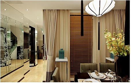 客廳內(nèi)中式簡(jiǎn)約的茶幾造型,在幾片綠葉地毯的襯托下,渲染了清靜無(wú)為的到家思想,茶亦有道,禪意十足。相對(duì)于此處濃烈的人文氛圍營(yíng)造,餐廳的陳設(shè)擺放就比較素雅,餐桌椅擺放位置利用玻璃鏡面形成景觀呼應(yīng),表現(xiàn)出小空間的體量擴(kuò)展,又以小配件搭配擺設(shè),構(gòu)應(yīng)出生活的氣氛。中式元素的引用是表現(xiàn)主題思想的一個(gè)手法,客廳的時(shí)尚地毯,取自于竹紋圖案,與鏡壁相呼應(yīng)。在色彩上主要以沉穩(wěn)的調(diào)子為主,并作局部突出的點(diǎn)綴,統(tǒng)一于潛藏中式環(huán)境中。新東方讓居室空間有了詩(shī)情畫(huà)意/韻律美感,倡導(dǎo)了生活的藝術(shù)新潮。