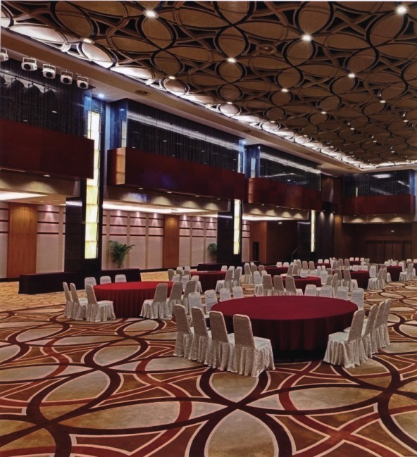 在這個(gè)酒店大廳的項(xiàng)目設(shè)計(jì)中,酒店宴會(huì)廳里內(nèi)部裝修以厚重暖色調(diào)來(lái)襯托莊重感。地毯圖案的設(shè)計(jì)與棚頂?shù)脑煨蛨D案相一致,形成空間上的視覺效果,使空間成為統(tǒng)一的整體,同時(shí)形成強(qiáng)烈的視覺沖擊。