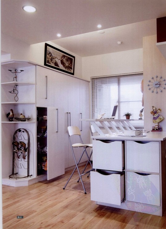 這個家的收納空間以廚房吧臺為中心,兼具了強大收納功能與獨特造型的寬闊吧臺,讓人完全無法想象定制柜的強大。此外,設(shè)計師帶著業(yè)主MM跑了好幾天的建材市場,MM也掌握了定制家具的可以隨心所欲的百變特質(zhì),預(yù)留了一個直立式冂形區(qū)域,將新購的餐桌隱身于吧臺內(nèi),依需求而收放。美式鄉(xiāng)村風(fēng)格的白色系統(tǒng)柜,美化了整個空間協(xié)調(diào)了空間的每一個元素。