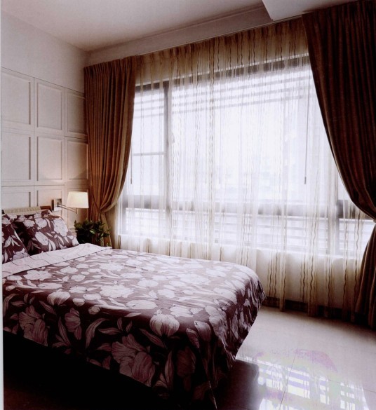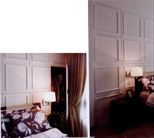 業(yè)主一向秉持清爽簡約風格,床頭的整面收納柜,設計師以美式風格線板制作門片,迎合主人的風格喜好,也讓人看不出柜體所在。