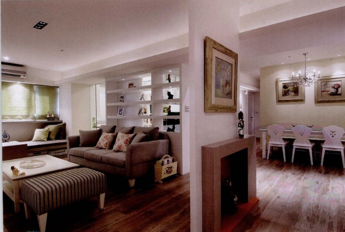 在大門入門處設(shè)置了壁爐造型隔屏,墻面既可掛畫作為端景,同時也讓客廳與玄關(guān)有了區(qū)隔,還可以擺上屋主旅行時帶回來的收藏品哦。
