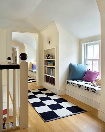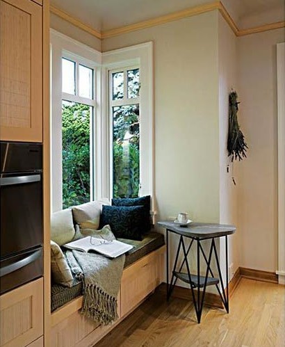 用柔軟的墊背營造出舒適、溫暖的感覺,旁邊加上的三角形小桌子,立馬在小小的空間內(nèi)獨立出一個休閑區(qū),可謂匠心獨運。