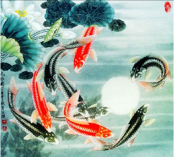 九魚圖是吉祥字畫的首選?!毒鹏~圖》幅繪了九條嬉戲的鯉魚。“九”有長久之意。“魚”為萬事如意。九條 可愛的魚在水中嬉鬧,寓決吉祥如意 。風水學中有紅色的魚可以旺運之說,所以家中懸掛一副《九魚荷花圖》可以旺運生財。家庭玄關處懸掛一幅九魚圖,是非常有風水意義的。