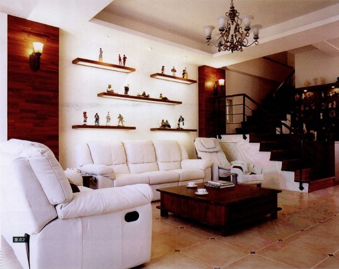 在氣氛和諧舒適的客廳,沙發(fā)后方主墻上下都有打光的層板,展示屋主旅游時收集的紀(jì)念品。階梯下方,可收納行李箱及大型換季電器??蛷d家具以簡約實用為主,沙發(fā)為白色的布藝,難清潔的讓人吃驚,偏愛鄉(xiāng)村風(fēng)格的業(yè)主卻不愛花朵,只追求自然舒適。