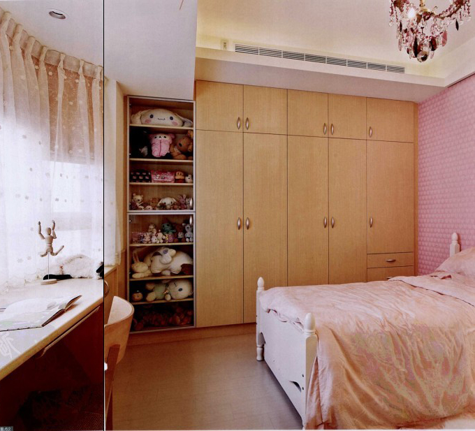 以優(yōu)雅的楓木搭配粉紅色壁紙,沿著墻面規(guī)劃收納衣柜,并搭配開放展示柜,用來存放展示大女兒收集保存的布偶玩具。利用書桌,化解了原本落地八角窗過低的恐懼感,同時(shí)還能邊看書邊觀賞風(fēng)景。