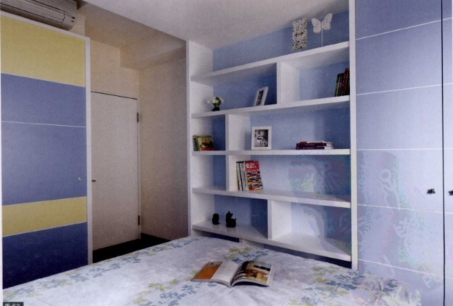因為兒子的有專用的書房,臥室就只作睡眠使用,所以收納以衣物和玩具為主,為此設計了展示柜及衣柜,并選擇活躍的色彩來點綴。運用黃色及藍色的門片,空間更活潑。