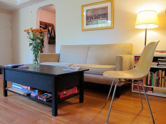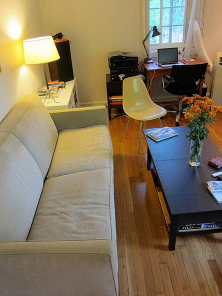 在黃色臺燈的照耀下,家里的燈光顯得柔和溫暖。從上方看上去,茶幾里面的書籍是收得嚴(yán)嚴(yán)實實的,看不出有什么破綻。書桌隔壁放著的收納柜,不僅放了書籍,也放了打印機,讓書桌的空間較大的同時也活用了收納柜頂部的空間。