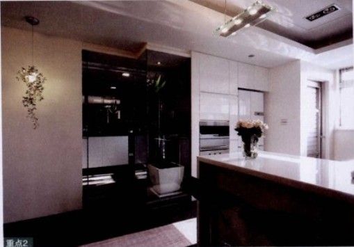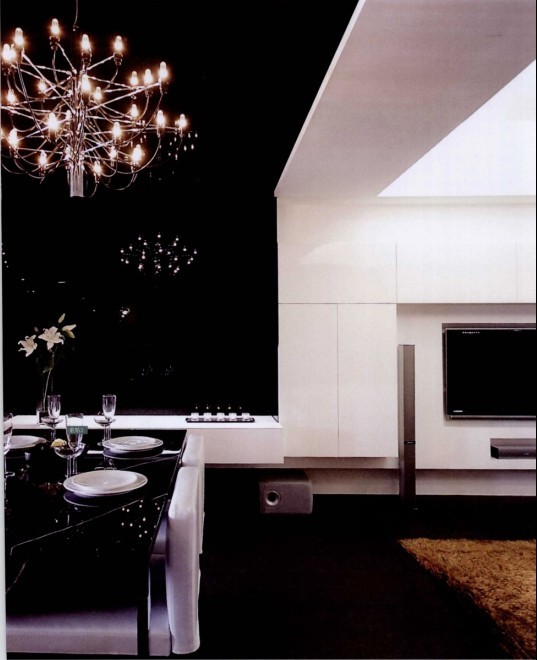 為展現(xiàn)現(xiàn)代簡約風格的簡潔明亮,設計師以黑白兩色來突顯空間個性,客廳電視柜以隱藏式手法設計,無手把的門片讓人看不出柜體的存在,喧囂同視聽音響設備都內(nèi)嵌收藏??蛷d與餐廳區(qū)隔的是地上大塊地毯,餐廳處只有地面磚,易于清理。而沙發(fā)區(qū)的長毛地毯則能給人舒適懶洋洋的感覺。