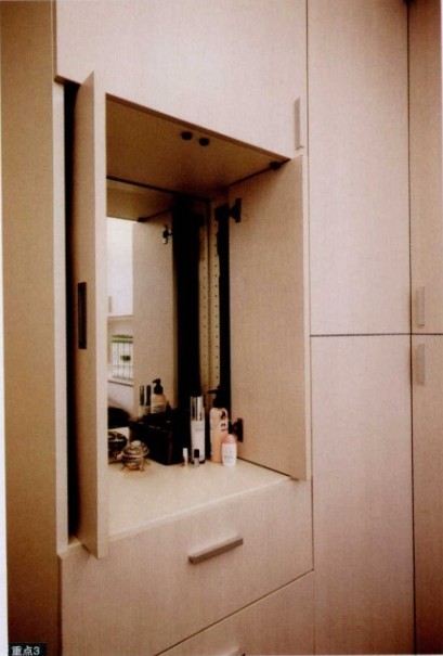 受限于空間大小,主臥沒有另外隔出更衣室,而女主人希望所有雜物都能夠收得干干凈凈。設(shè)計(jì)師在床頭板及左側(cè)墻面規(guī)劃了衣物收納柜,化妝臺(tái)也以所推拉式隱藏其中。