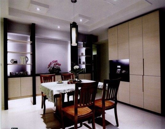 餐廳規(guī)劃了落地收納柜及展餐柜,并配合隱藏式燈,讓空間更為明亮,并減少壓迫感。因?yàn)樵O(shè)有隱藏的展示柜后面的燈具,餐廳里只用一盞簡單的燈具,與利落的空間相呼應(yīng)。