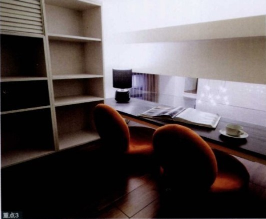 夾層上方為書房,雖然空間不大,但卻具備了收納功能,格子狀的開放式書柜可收納書籍及雜物。而女兒房夾層的畸零空間設(shè)計(jì)有收納棉被及床墊等的柜子。