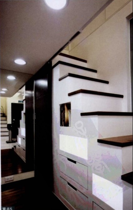 通往女兒房的樓梯側(cè)邊規(guī)劃收納抽屜以及陳列架,以收納物品,其也可作為衛(wèi)浴用品的收納柜。